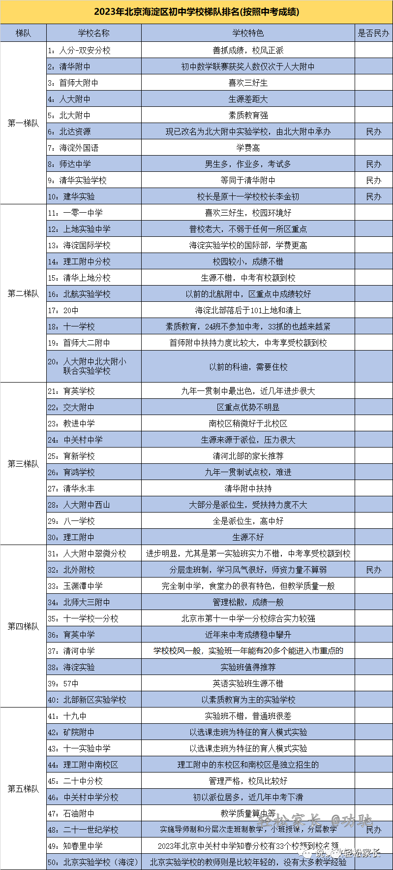 下面是一张网传的海淀初中排序表,其实排名啥的都是其次,毕竟现在数据官宣的很少,都只能东拼西凑出来,所以难免会有失偏颇,不用太过当真。但可以看看里面总结的学校特色👇